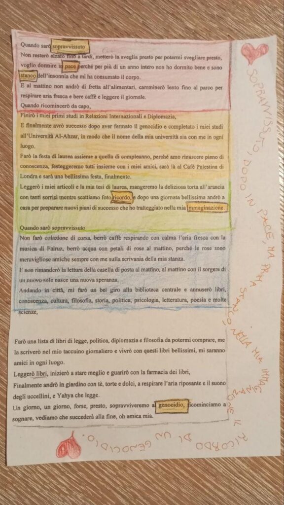 Alla fine su un testo poetico di YAHYA (ragazzo palestinese con cui il Comitato Un aiuto per la Palestina ha i contatti) ho lasciato che ognuno esprimesse le proprie emozioni e i pensieri con la tecnica del caviardage (metodo di scrittura poetica). Vi mando qualche pensiero e un paio di caviardage quasi terminati.